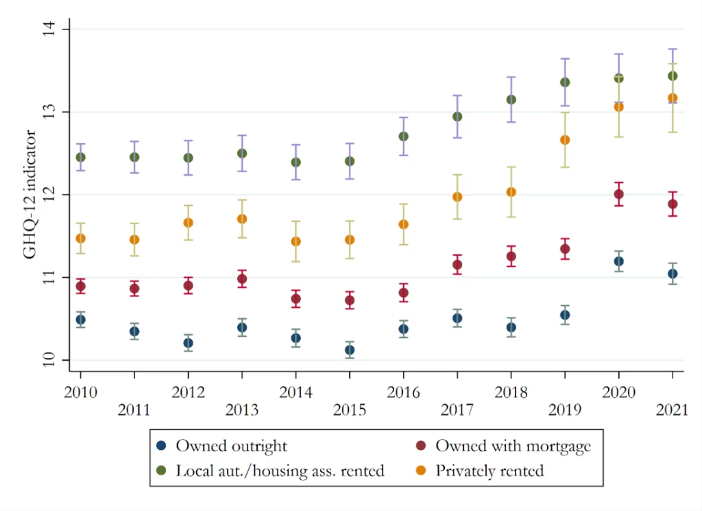 The GHQ-12 indicator is included in the United Kingdom Household Longitudinal Study, also known as Understanding Society, a large survey gauging many domains of households’ life. Using 13 waves of the survey, from which I can estimate yearly averages between 2010 and 2021, I study how the GHQ-12 has evolved over time across four housing tenure groups: outright homeowners, mortgagors, private renters and those renting from local authorities or housing associations (social housing).